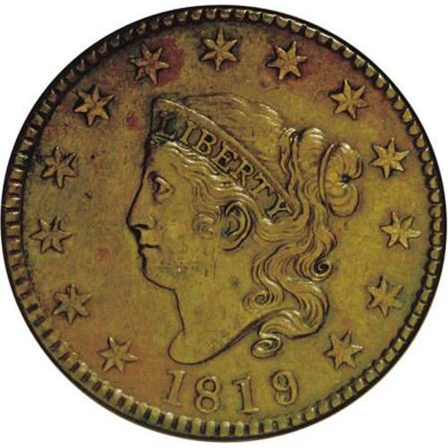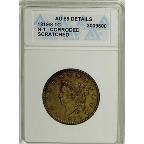 <B>1819/8 1C --Corroded, Scratched--ANACS. AU55 Details.</B></I> N-1. NGC Census: (2/52). PCGS Population (12/28). Mintage: 2,671,000. Numismedia Wsl. Price for NGC/PCGS coin in AU55: $410. (#1612)<BR><BR><B>Coin Engraver:</B> Robert Scot or John Reich<BR><BR><b>Shipping:</b> Coins & Currency (<a target="_blank" href="http://www.heritageauctions.com/common/shipping.php">view shipping information</a>)