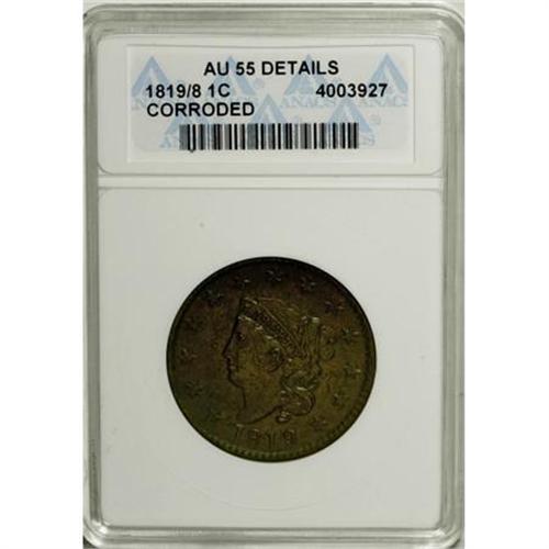 <B>1819/8 1C --Corroded--ANACS. AU55 Details.</B></I> NGC Census: (2/52). PCGS Population (12/28). Mintage: 2,671,000. Numismedia Wsl. Price for NGC/PCGS coin in AU55: $410. (#1612)<BR><BR><B>Coin Engraver:</B> Robert Scot or John Reich<BR><BR><b>Shipping:</b> Coins & Currency (<a target="_blank" href="http://www.heritageauctions.com/common/shipping.php">view shipping information</a>)