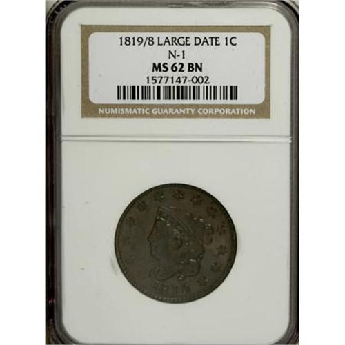 <B>1819/8 1C MS62 Brown NGC.</B></I> N-1. NGC Census: (13/15). PCGS Population (3/12). Mintage: 2,671,000. Numismedia Wsl. Price for NGC/PCGS coin in MS62: $700. (#1612)<BR><BR><B>Coin Engraver:</B> Robert Scot or John Reich<BR><BR><b>Shipping:</b> Coins & Currency (<a target="_blank" href="http://www.heritageauctions.com/common/shipping.php">view shipping information</a>)
