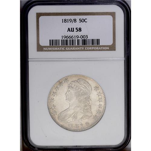 <B>1819/8 50C Large 9 AU58 NGC.</B></I> O-104, R.1. A widely recut second star promptly identifies the Overton variety of this lightly toned and partly lustrous piece. The surfaces are slightly subdued but without unpleasant marks. Struck from clashed dies. NGC has only certified two pieces in Mint State as O-104 or O-104a.