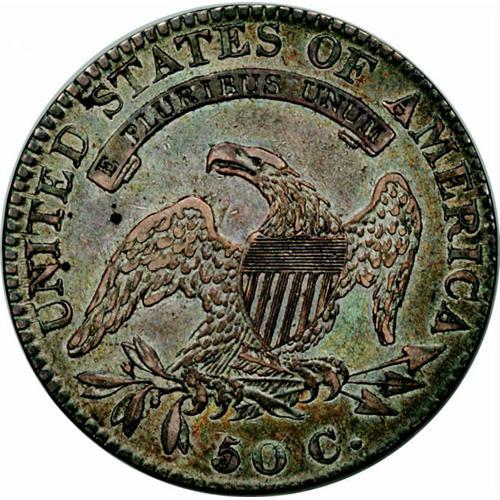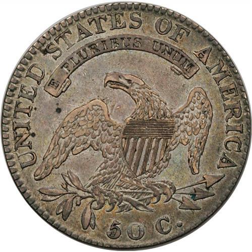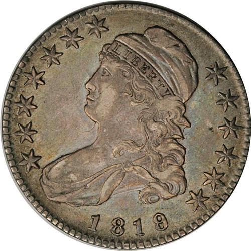 <B>1819/8<50C> Large 9 XF45 NGC.</B></I> O-105, R.2. A solid bar joins the tail and the loop of the 9. A tiny notch at the right bases of the As on the reverse also helps identify this variety. Deeply toned overall with iridescent gold and blue hues visible at certain angles. Well struck, some die clashing is noted on each side.<BR><I>Ex: J.J. Teaparty (7/9/1986).</B></I> Envelope Included.