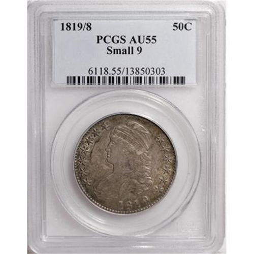 <B>1819/8 50C Large 9 AU55 PCGS.</B></I> O-103a, R.4. Incorrectly labeled as a Small 9 by PCGS. The network of slender reverse die cracks confirms the late die state. Dusky dove-gray and caramel-gold embrace this satiny and lightly abraded example.<BR><BR><B>Coin Engraver:</B> John Reich<BR><BR><b>Shipping:</b> Coins & Currency (<a target="_blank" href="http://www.heritageauctions.com/common/shipping.php">view shipping information</a>)