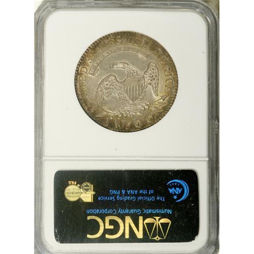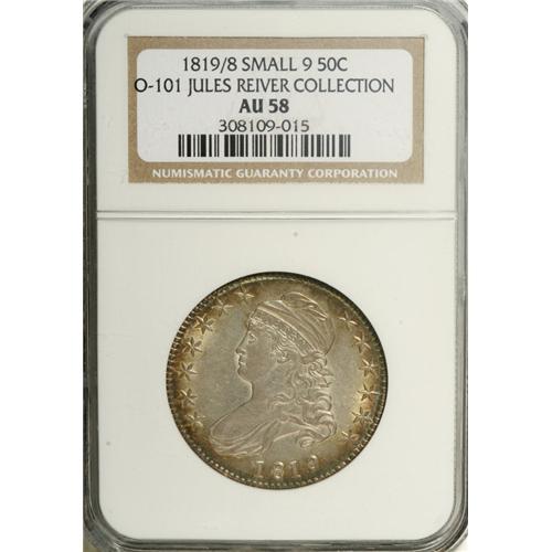 <B>1819/8 50C Small 9 AU58 NGC.</B></I> Ex: Jules Reiver Collection. O-101, R.1. Small, narrow 9 with an open tail and a solid twin segment below 50 on the reverse characterize this variety. Light rubbing on the highest points does not detract from the abundant remaining mint luster. Some golden-brown and gunmetal-blue toning circles the outer borders. Reiver's envelope included.<BR><I>Ex: Jules Reiver Collection (Heritage, 1/06), lot 22789.</B></I><BR><I>From The Rocky Top Collection of Bust Half Dollars.</B></I><BR><BR><b>Shipping:</b> Coins & Currency (<a target="_blank" href="http://www.heritageauctions.com/common/shipping.php">view shipping information</a>)