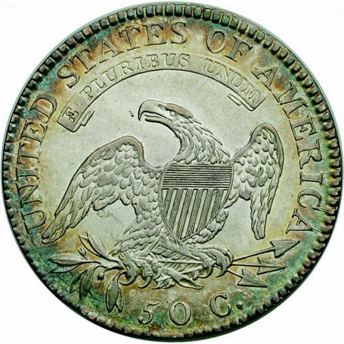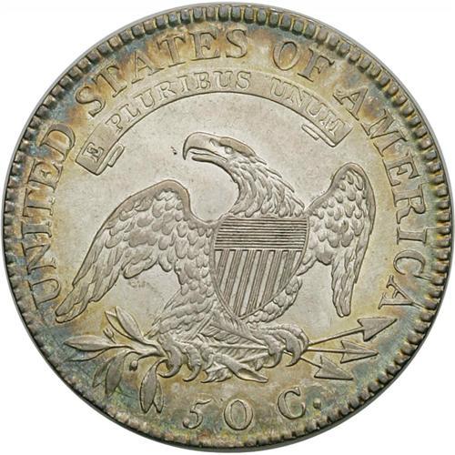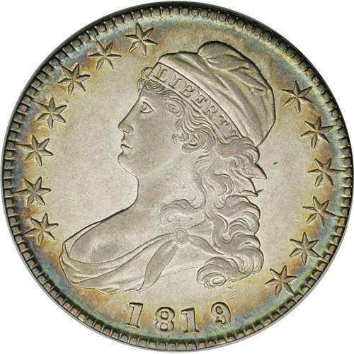 <B>1819/8<50C> Small 9 AU58 NGC.</B></I> O-101, R.1. Small, narrow 9 with an open tail and a solid twin segment below 50 on the reverse characterize this variety. A die crack extends from the E of AMERICA around the periphery to the top of the TA of STATES. Light rubbing on the highest points does not detract from the abundant remaining mint luster. Some golden-brown and gunmetal-blue toning circles the outer borders. One of the more common of the 1819/8 overdate varieties. Envelope Included.