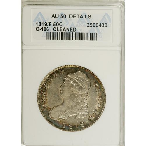 <B>1819/8 50C Small 9--Cleaned--ANACS. AU50 Details.</B></I> O-106. NGC Census: (20/143). PCGS Population (28/78). Numismedia Wsl. Price: $350. (#6118)<BR><BR><b>Shipping:</b> Coins & Currency (<a target="_blank" href="http://www.heritageauctions.com/common/shipping.php">view shipping information</a>)