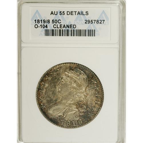 <B>1819/8 50C Small 9--Cleaned--ANACS. AU55 Details.</B></I> O-104. NGC Census: (31/89). PCGS Population (18/51). Numismedia Wsl. Price: $458. (#6118)<BR><BR><b>Shipping:</b> Coins & Currency (<a target="_blank" href="http://www.heritageauctions.com/common/shipping.php">view shipping information</a>)