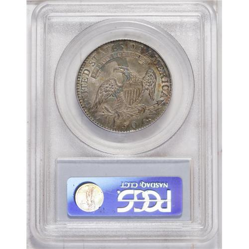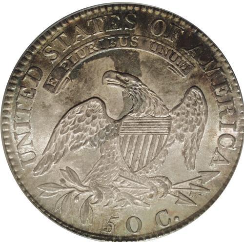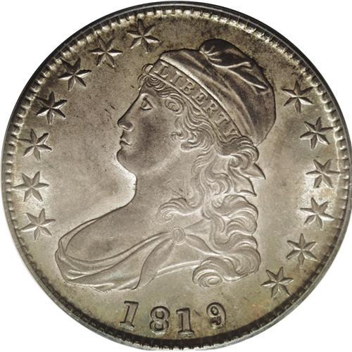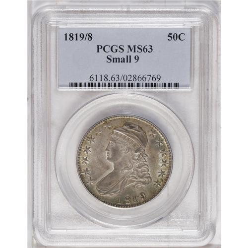 <B>1819/8<50C> Small 9 MS63 PCGS.</B></I> O-101, R.1. Small, narrow 9 with an open tail and a solid twin segment below 50 on the reverse confirm this variety. A delicate mix of light gray, cobalt-blue, and champagne-gold covers lustrous surfaces, and is joined by crimson and gold-orange accents along the reverse periphery. The design elements are nicely centered and sharply impressed throughout, and the dentilation is almost complete on both sides. Just a few minor handling marks are noted on Liberty's cheek, neck, and chest. A fine die crack travels from above the first T in STATES through the tops of the letters in UNITED and the tips of the olive leaves and then bisects 50.
