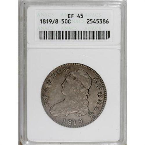 <B>1819/8 50C Small 9 XF45 ANACS.</B></I> NGC Census: (25/167). PCGS Population (12/104). Numismedia Wsl. Price for NGC/PCGS coin in XF45: $249. (#6118)<BR><BR><B>Coin Engraver:</B> John Reich<BR><BR><b>Shipping:</b> Coins & Currency (<a target="_blank" href="http://www.heritageauctions.com/common/shipping.php">view shipping information</a>)