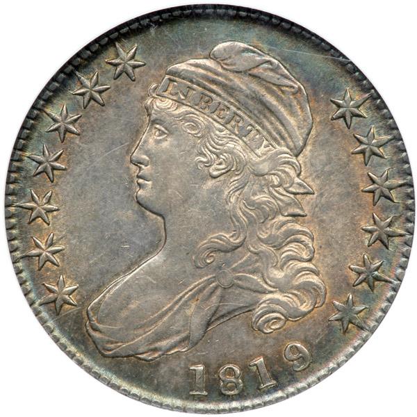 1819/8 Capped Bust Half Dollar. Large 9. NGC graded AU-58. Lovely multi-color toning on both sides adds to its strong eye appeal. Pop 13; 3 finer for the variety.