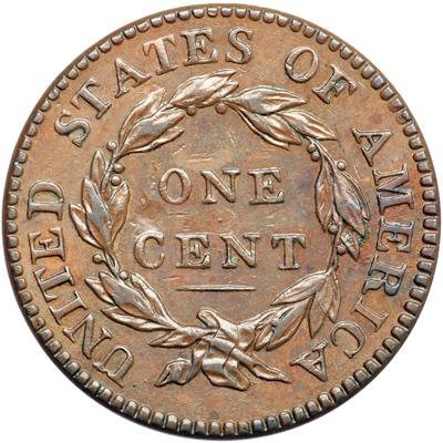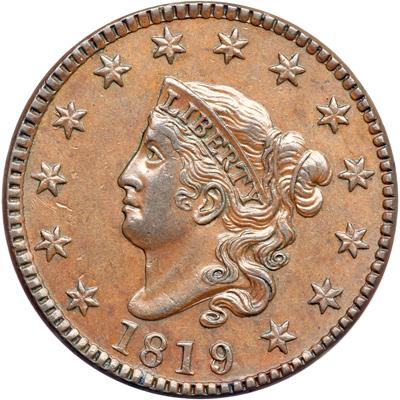1819/8 N-1 R1. EF-45 Plus. Overdate 9 over 8. Glossy medium brown with slightly darker steel brown toning on the highpoints. The only marks are a couple nicks around the O in ONE and a shallow low spot (caused by debris on the die) over the C in CENT. Sharply struck EDS with smooth, slightly reflective fields on both sides. The overdate feature is bold. A very attractive example, close to AU50.