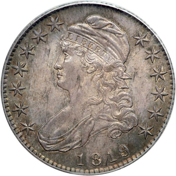 1819 Capped Bust Half Dollar. . O-114. PCGS graded MS-64 CAC Approved. Attractive natural antique toning which is slightly iridescent. There were fifteen die marriages to produced the estimated 2,208,000 half dollars of 1819. Pop 10; 3 in 65 (PCGS # 6117) .