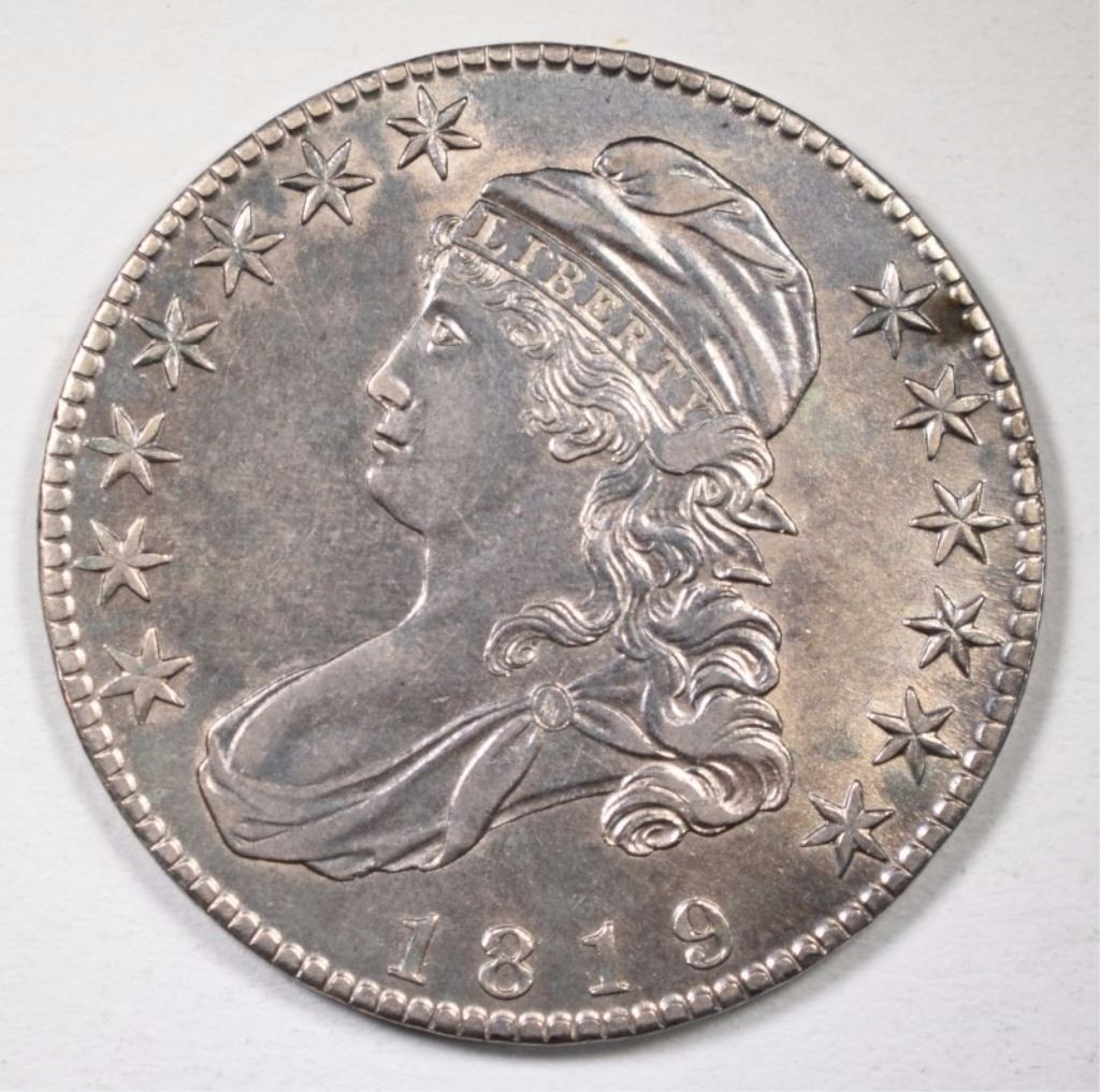 1819 CAPPED BUST HALF DOLLAR, AU ESTIMATE, $700.00 TO $800.00