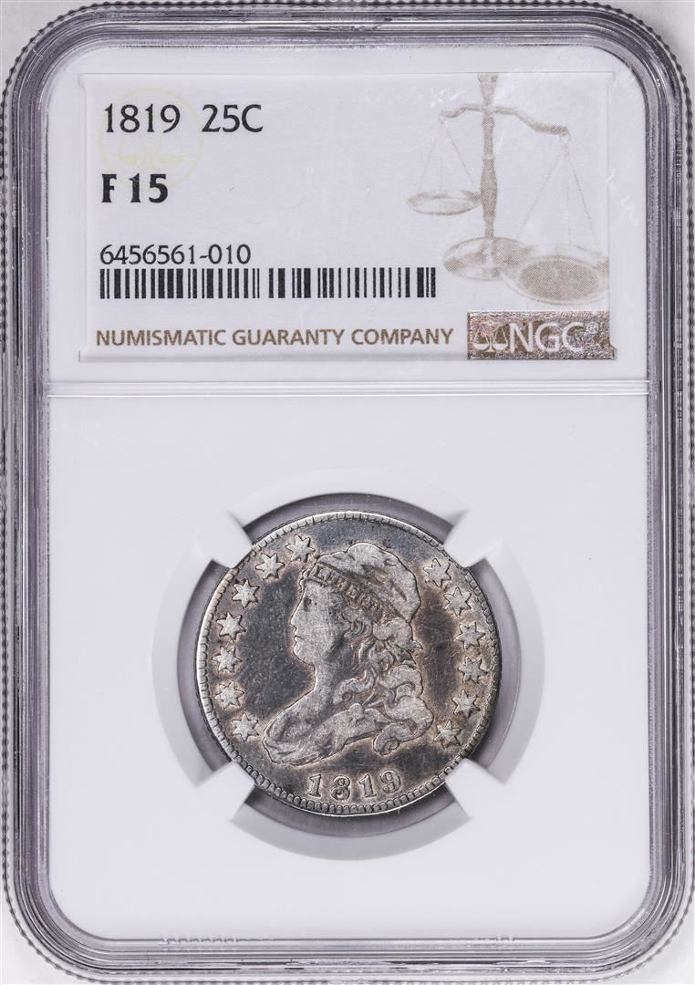 One 1819 Capped Bust Quarter Coin NGC F15. NGC Certified.