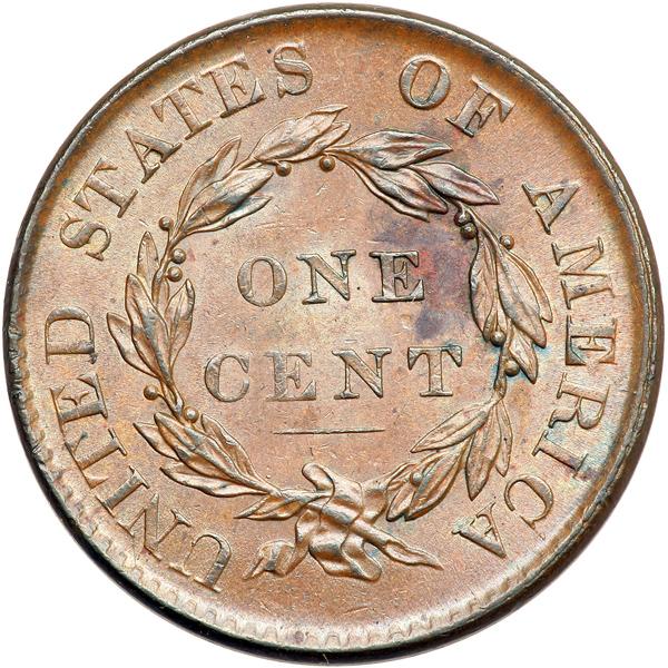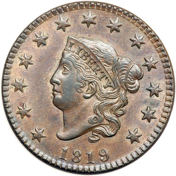 1819 Coronet Head Cent. PCGS graded MS-62 Brown. Glossy medium brown and chocolate with steel brown toning on the highpoints and frosty luster covering the fields and protected areas. A splash of reddish chocolate toning right of the E in ONE is the only defect that catches the eye, but there are a few light contact marks as well. These are a dull nick on the tip of the nose into the field and some tiny rim nicks at ED in UNITED. MDS. The obverse fields are now satiny from fine die flowlines and microscopic die rust. The die line that connected the bases of the T & E in STATES in the earlier state is now incomplete and does not reach the T. In the upper half of the condition census for this scarce variety. Called AU55 and CC#2 among the confirmed examples in the Bland census. Noyes says MS60 net EF45 and CC#5 in his census, photo #21026. Our grade is AU50. Pop 1; 1 in 64. Only 2 graded at PCGS for the variety. DWH #2582 (PCGS # 36640) .