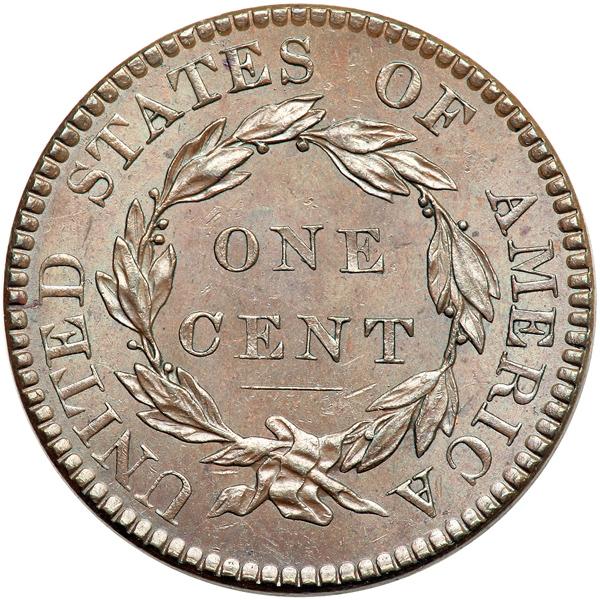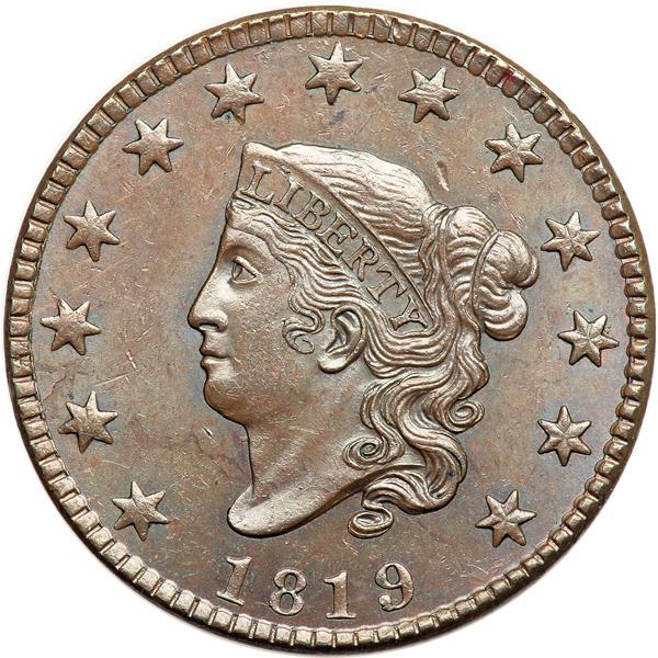 1819 Coronet Head Cent. PCGS graded MS-63 Brown. Lustrous light bluish steel brown. Just a few very light contact marks, including a dull nick near the hair under star 8 and a tiny swipe of carbon under star 7. Sharply struck EDS. The obverse fields are smooth and slightly reflective and a sharp die line connects the bases of the T & E in UNITED. Most likely from the famous Randall Hoard of mint state cents. Our grade is MS60. Pop 2; None finer in Brown at PCGS. DWH #0489 (PCGS # 36649) .