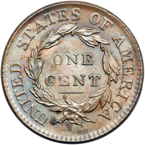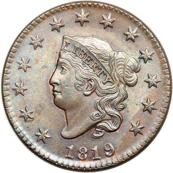 1819 Coronet Head Cent. PCGS graded MS-64 Brown. Lustrous light bluish steel brown with traces of faded mint red remaining in protected areas. There is a small planchet chip in the center of the cheek and another very shallow one in the field right of star 4, as struck. An arc of slightly darker toning shows at the tops of ATE in STATES, and this darker area contains microscopic roughness. The only other notable mark is a small spot of darker toning on the tip of the wreath ribbon. Otherwise the surfaces are frosty and very attractive. M-LDS with fine radial die flowlines covering the fields and severely weakened dentils on the upper half of the reverse. The reverse is rotated 35 degrees CCW. Called MS60+ and tied for CC#1 in the Bland census. Noyes says MS60 and tied for CC#2, his photo #20942. Comes with an impressive provenance.Our grade is MS60. Pop 2; None finer at PCGS. Only 2 examples graded at PCGS. DWH #2655 (PCGS # 36643) .