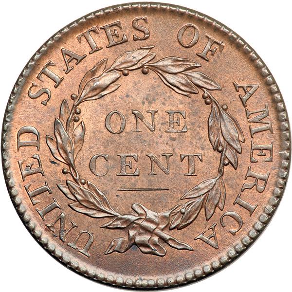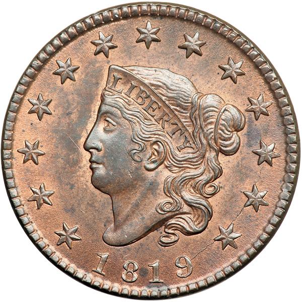 1819 Coronet Head Cent. PCGS graded MS-64 Red & Brown. Frosty slightly faded mint red mellowing to steel brown, about half the faded red remaining. Covered with satiny mint luster and close to gem except for a short, fine hairline scratch in the field off the nose tip plus a few tiny ticks on the cheek and in the field off the chin. A good identifying mark is a small spot of darker bluish steel toning between the 8 and second 1 in the date. E-MDS. The dentils are complete around both sides and the bottom of the C in CENT is clear. An outstanding example of this very scarce variety. Called MS65 and tied for CC#1 with one other piece in the Bland census. Noyes says MS61 and CC#3, his photo #25191. The obverse is plated in the Newcomb book to illustrate the variety and the reverse is also plated to show reverse H. Comes with the Newcomb collection pillbox. Our grade is MS63, Pop 2; Tied for finest graded in Red Brown at PCGS for the variety. DWH #2584 (PCGS # 36656) .