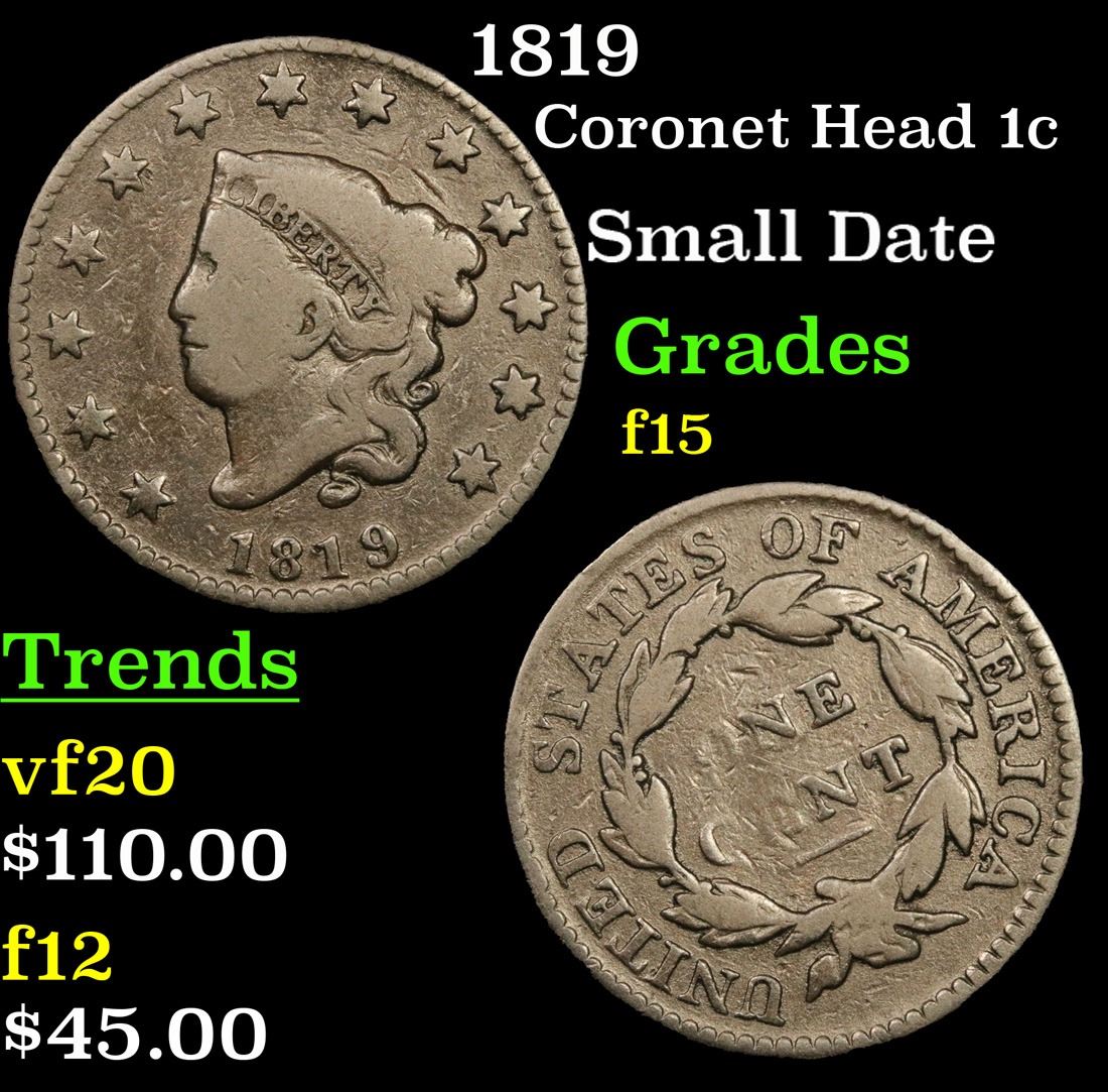 1819 Small Date . Coronet Head Large Cent 1c Grades f+.