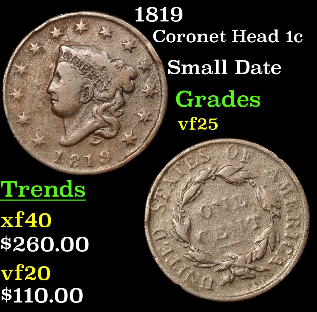 1819 Small Date . Coronet Head Large Cent 1c Grades vf+.