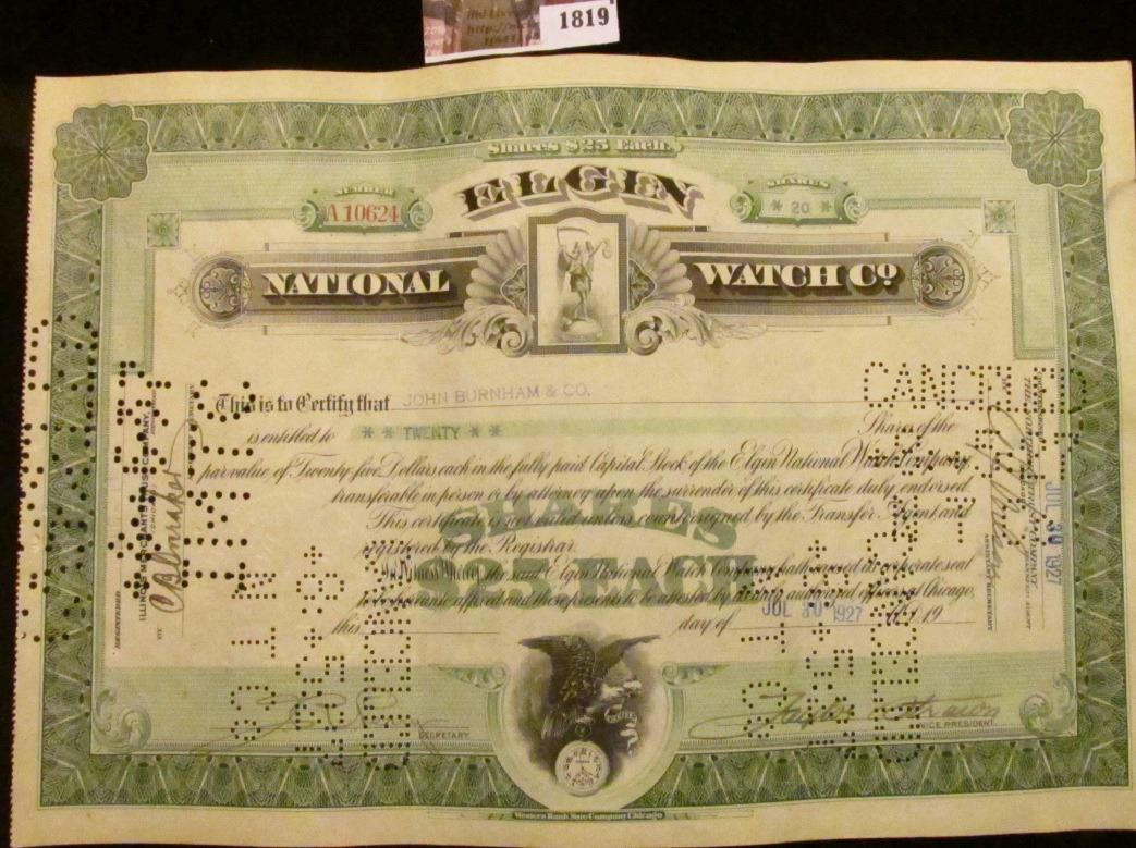 1819 . July 30th, 1927 Stock Certificate for 20 Shares "Elgin Natio