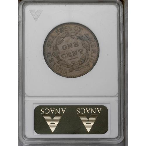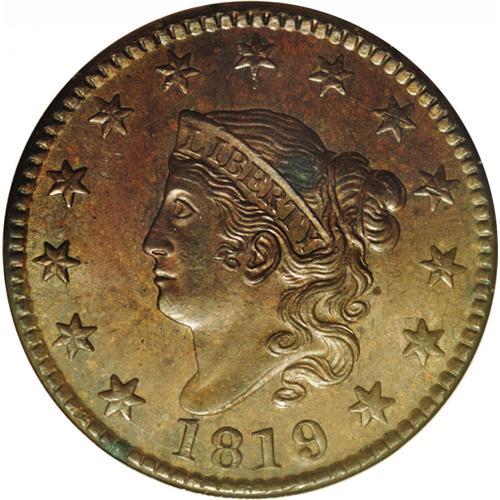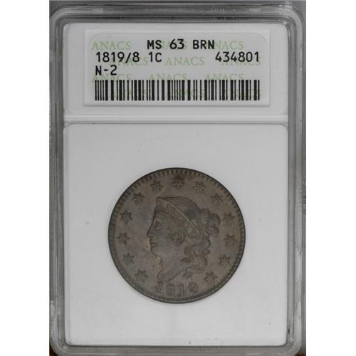 <B>1819<1C> Large Date MS63 Brown ANACS.</B></I> N-2, R.1. Lustrous medium olive surfaces with only light rubbing on the high points. The obverse has a faded green corrosion spot hidden in the hair above the R of LIBERTY. Described by ANACS as an overdate, however, we do not agree with such a designation. EAC 45. <BR><BR><B>Important notice:</B> Heritage usually auctions material at the rate of 200-250 lots per hour. On some occasions eBay Live bid software or the Internet may not be able to keep up with the pace of the auction. We recommend placing a realistic absentee bid now as insurance to avoid disappointment. Occasionally the auctioneer may eliminate or reject an eBay Live bid, and the auctioneer may also reopen a lot after the close of the eBay live bidding (usually because we missed an audience bid), and may reject your bid even if it shows you as the winning bidder. By bidding via eBay Live, you agree that Heritage may award the lot to another bidder at its sole discretion under the circumstances described above or any other reasonable circumstances. Since eBay bids are not shown to us until we open the lot on the floor, we treat those bids just like floor bids. In most cases the floor responds before the eBay bid is presented to us, due to Internet lag time, so for consistency we have made it a policy that floor bids are always considered first over tie eBay live bids. Also please note that all Heritage lots purchased through eBay Live carry a 20% Buyer's Premium. Please make sure you read the Terms and Conditions before you bid. This lot is being auctioned in conjunction with a live floor auction by Heritage Galleries & Auctioneers. All final auction and invoice information will be supplied by Heritage Galleries & Auctioneers, and all other information should be considered preliminary. Lot:265 <BR><BR><B>Winning Notification and Billing:</B> After the FINAL session in this auction is complete, Heritage will send e-mail and snail mail invoices. This process normally takes several days. All final auction and invoice information will be supplied by Heritage Galleries & Auctioneers, and all other information should be considered preliminary. <BR><BR>This auction will be conducted on a live auction floor and over the Internet through eBay Live. If you choose to place an absentee bid, please take a moment to <font color='#0000ff'><u><a href='http://pages.ebay.com/liveauctions/help/before/laabsentee.html'>learn how eBay Live absentee bidding works</a></u></font><font color='#000000'>