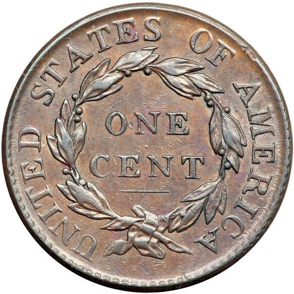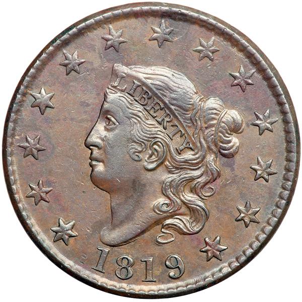 1819 N-2 R1 EF40+. Large Date. EF-40+. Slightly sharper but there are a few small splashes of reddish steel toning on the obverse, and these splashes show traces of extremely fine roughness. No verdigris, and the only contact mark of any consequence is a small scrape on the rim at the right top of the F in OF. LDS. Both dies have been lapped to remove all traces of die rust and the fields are now smooth and slightly reflective. The repunching between the ball and loop of the 9 is gone as well, but the repunching on the 8 and along the bottom of the 9 remains clear. The reverse is rotated 25 degrees CCW. DWH #3131.