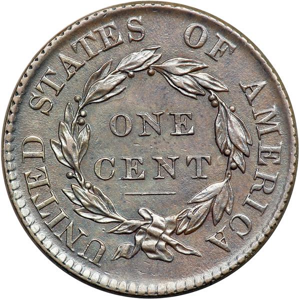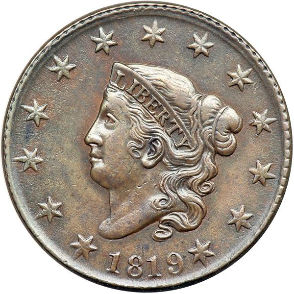 1819 N-3 R3 EF40. EF-40. Glossy chocolate and light olive brown with hints of very faded red in protected areas of the obverse. A couple very tiny ticks on the neck and a vertical nick on the upper right edge of the 8 from flawless. A choice example. LDS. The die crack from the bust into the field right of star 1 is visible but the repunching on the right top of the N in UNITED is now gone. Clear die clashmarks now show at the throat, over the O in ONE, and right of the T in CENT. Called EF40 net VF35 in the Noyes census, his photo #36202. DWH #3460.