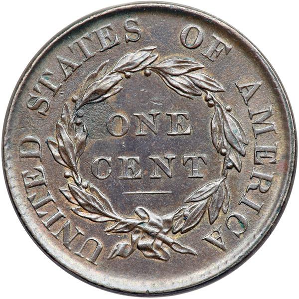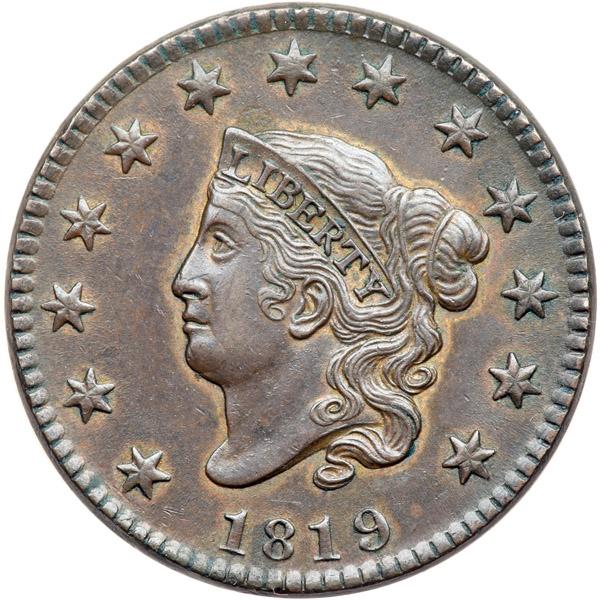 1819 N-5 R3 AU50. Sharpness very close to mint state but there is a patch of faint roughness left of the O in ONE plus smaller ones resting on top of the coronet over the L and at the top of star 10. Otherwise this piece is virtually flawless. Very attractive lustrous chocolate brown with lighter golden brown and tan faded down from mint color in protected areas, mostly on the obverse. MDS. A new discovery that has not been seen by Bland or Noyes, but certainly a candidate for the condition census. Comparable to the Holmes example, lot 115 in our 30 May 2010 auction, that brought $4025.