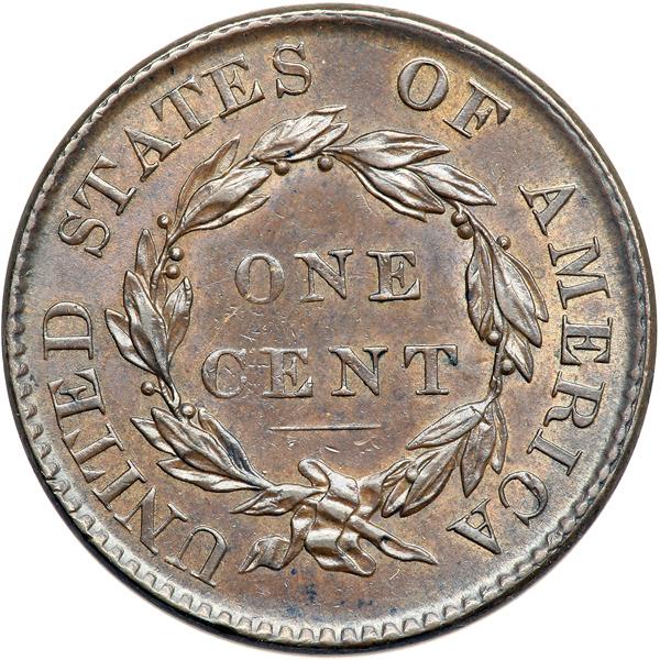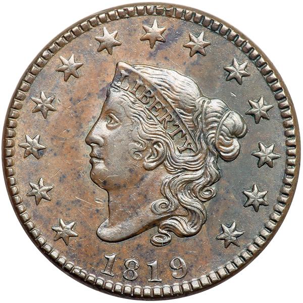1819 N-5 R3 EF45. EF-45. Glossy steel and medium brown with darker olive brown covering the right side of the obverse and frosty lighter steel brown in protected areas. There is a dull, light nick on the chin and another in the field below, plus a fine vertical hairline over star 13. EDS. The obverse fields are before hard and slightly reflective and a die line connects the bases of the T & E in STATES. A variety that's difficult to find in high grade, this one solidly in the condition census. Called EF45 and CC#3 among the confirmed examples in the Bland census. Noyes says AU50 net EF40 and tied for CC#6 in his census, photo #36032. DWH #0483.