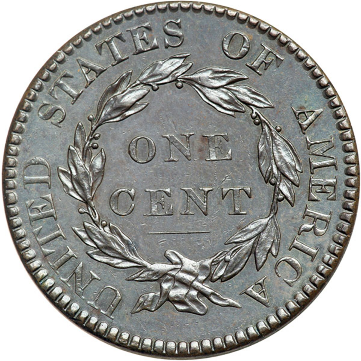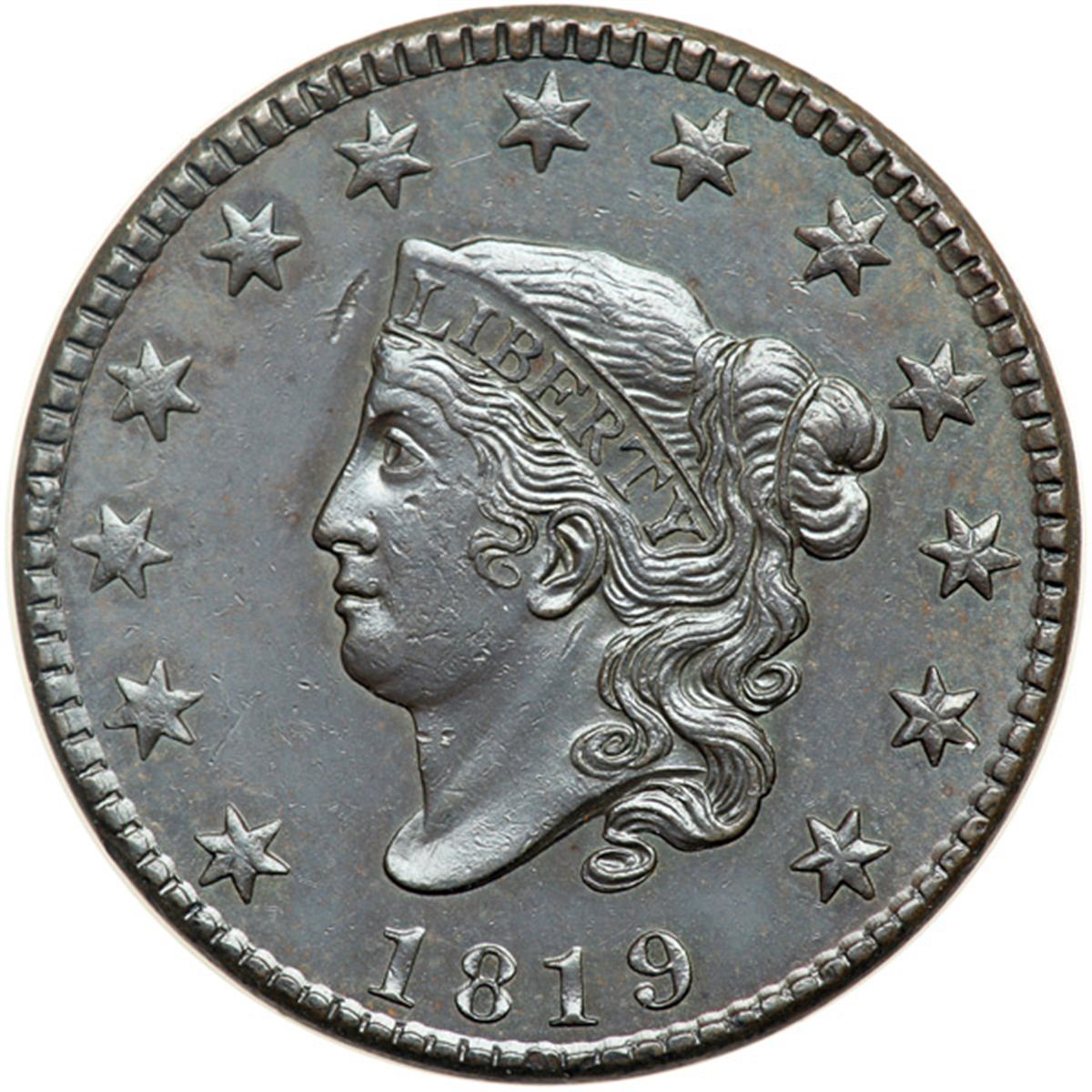 1819 N-8 R1 AU58. Mint state sharpness but there are too many tiny ticks on the cheek for a mint state piece, none visible without a good glass, plus a larger nick in the field between the coronet and star 5. Lustrous dark steel and olive. EDS with smooth, hard fields on both sides. Most likely from the Randall Hoard of mint state cents.