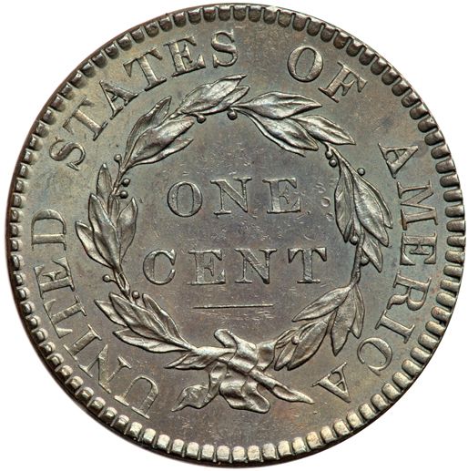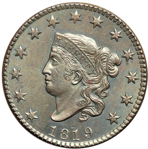 1819 N-8 R1 AU58. A sharp, lustrous mint state cent but it has a few too many tick contact marks for a mint state grade. None of the marks is significant or distracting and the eye appeal is quite nice. Lustrous light olive and steel with sea-green overtones (a classic "greenie" as Doug Smith would say). The best identifying mark is a small spot of slightly darker toning on the top of the first A in AMERICA. Sharply struck EDS. Removed from an NGC slab graded MS62 Brown (NGC label included, #3170863/001).