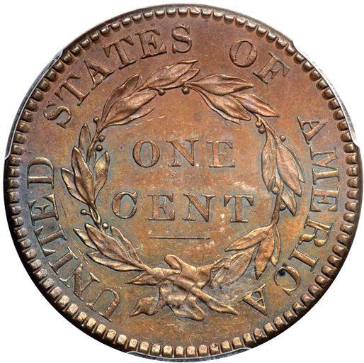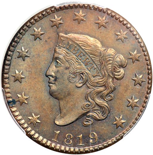 1819 N-8 R1. PCGS graded MS-63 Brown. Frosty light steel and reddish brown with hints of bluish steel tones in protected areas. Sharply struck and free of contact marks. The notable defects are a carbon spot between star 2 and the dentils, a smaller spot of dark toning just right of the nostril, and an even smaller one at the base of the C in AMERICA. EDS. Most likely from the Randall Hoard of mint state cents. Our grade is MS60.