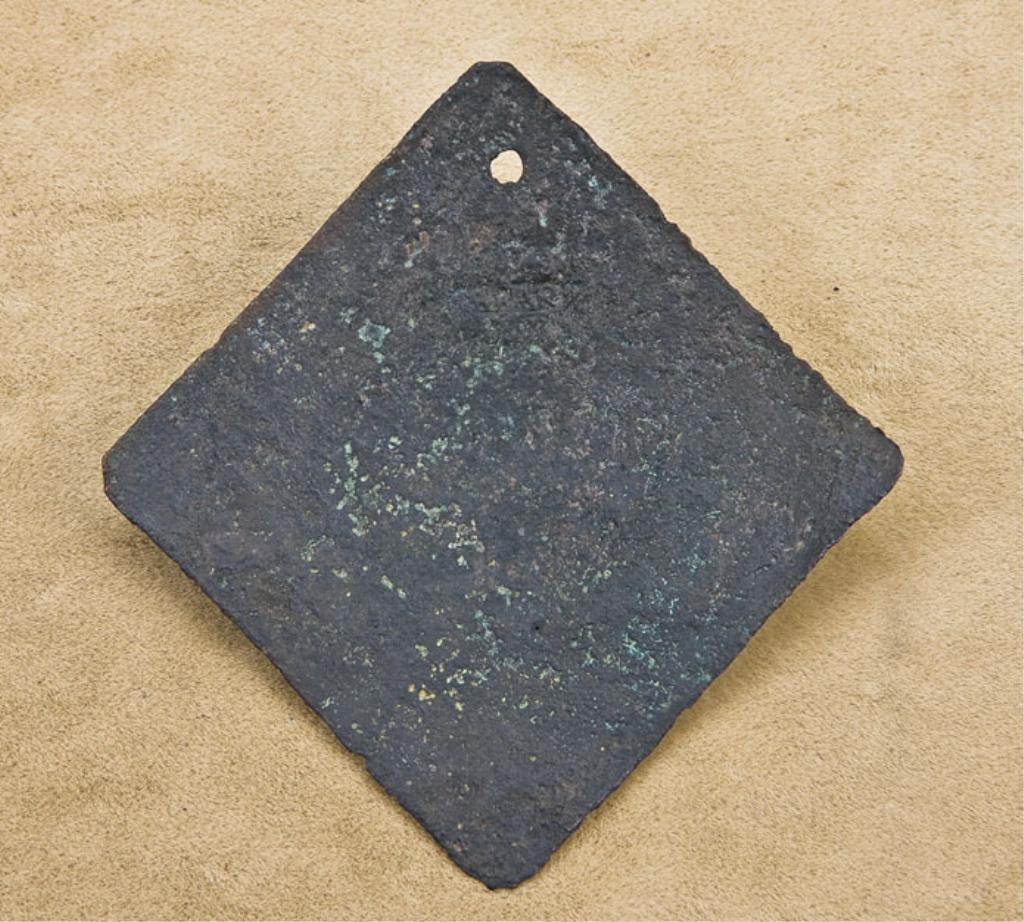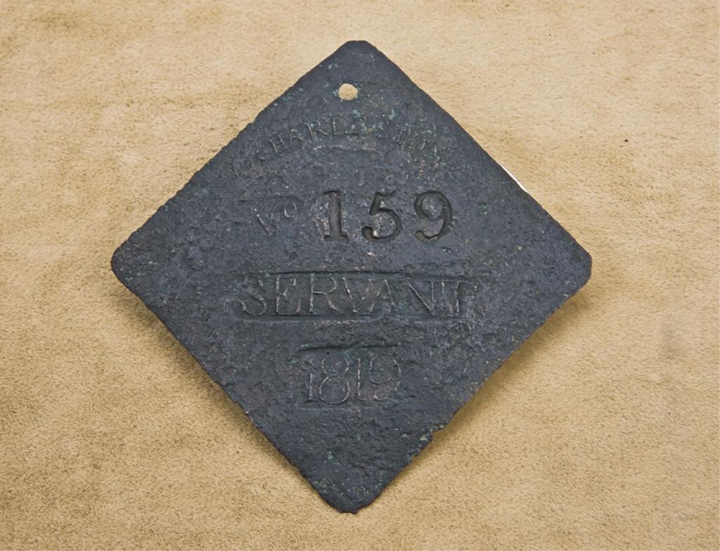 1819 dated Charleston Servant metal “tag” No. 159, approx. 2-1/4” square and in fair only condition showing a dark black patina and what appears to be fire scale along with traces of green corrosion. The authenticity of this piece cannot be verified however it does appear to have age. This lot is therefore sold as is where is. Est.: $400-$600.