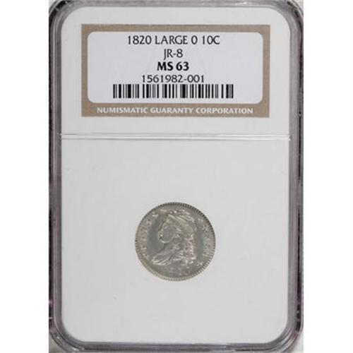 <B>1820 10C Large 0 MS63 NGC.</B></I> JR-13, R.2. Misattributed on the NGC holder as JR-8, when in fact it is JR-13, that is attributed by the curl extending to the right edge of digit 2 in the date, and doubling on the top serif of 1 in the denomination. Lustrous surfaces are essentially untoned, and display sharp definition on the design features. We note a few minute obverse marks.<BR><BR><B>Coin Engraver:</B> John Reich<BR><BR><b>Shipping:</b> Coins & Currency (<a target="_blank" href="http://www.heritageauctions.com/common/shipping.php">view shipping information</a>\)