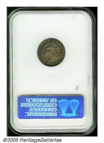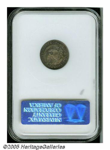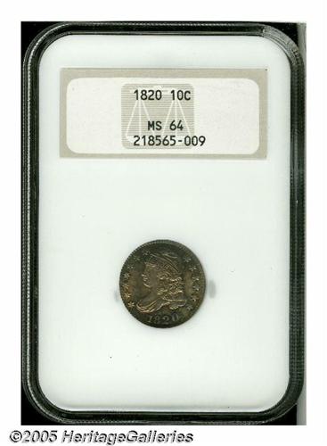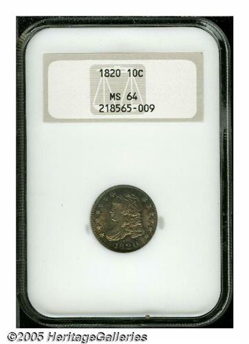 <B>1820<10C> Large 0 MS64 NGC.</B></I> JR-2, R.3. Sea-green, chestnut-gold, and rose-red colors illuminate the borders of this lustrous near-Gem. Well struck except for the right side stars and the curl near the bust truncation. Thorough examination does not discover any noticeable marks. A worthy addition to an advanced type set or specialized early dime holding.