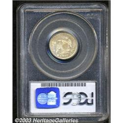1820 10C Large 0 MS66 PCGS. JR-11, R.3. The T in UNITED is high, and this serves to identify this variety. Each side has a tiny center dot, located below Liberty's ear on the obverse and on the left center of the horizontal shield lines on the reverse. Dies from this era were laid out using a compass, and the compass point, depressed on the die, is raised on all pieces that were struck from it. According to the standard reference for the series, the John Reich Collector Society's Early United States Dimes, JR-2 and JR-3 are the Small 0 varieties, while JR-8, JR-9, and JR-13 are Large 0 varieties. On JR-11, the 20 digits in the date are roughly the same size, although both are larger than the preceding 18 digits. This meticulously struck Gem has flashy semi-prooflike luster and exceptionally clean surfaces. Dusky golden-brown patina encroaches upon the centers of this otherwise untoned example. The dies are slightly rotated counterclockwise. Population: 6 in 66, 1 finer (10/03). Important notice: Heritage usually auctions material at the rate of 200-250 lots per hour. On some occasions eBay Live bid software or the Internet may not be able to keep up with the pace of the auction. We recommend placing a realistic absentee bid now as insurance to avoid disappointment. Occasionally the auctioneer may eliminate or reject an eBay Live bid, and the auctioneer may also reopen a lot after the close of the eBay live bidding (usually because we missed an audience bid), and may reject your bid even if it shows you as the winning bidder. By bidding via eBay Live, you agree that Heritage may award the lot to another bidder at its sole discretion under the circumstances described above or any other reasonable circumstances. Also please note that all Heritage lots purchased through eBay Live carry a 20% Buyer's Premium. Please make sure you read the Terms and Conditions before you bid.