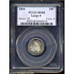 <table><tr><td><TABLE cellSpacing=0 cellPadding=0 width="100%" bgColor=#000000 border=0><TBODY> <TR><TD width="100%"><TABLE cellSpacing=1 cellPadding=3 width="100%" border=0><TBODY><TR><TD width="100%" bgColor=#79735c><FONT face=arial color=#ffffff size=3><B>Description</B> </FONT></TD></TR><TR><TD width="100%" bgColor=#ffffff><FONT face=arial size=2><B>1820 10C Large 0 MS68 PCGS.</B></I> JR-9, R.4. An exquisite Large Size Bust dime, this piece is not only the finest piece known for the JR-9 variety but is also the finest known for the date as well as the highest graded coin of the type. The dominant theme of this amazing coin is its exceptional mint luster. Bright and frosted, it rolls around the surfaces unimpeded by any obvious or distracting abrasions. The only ripple on the surface of the coin is faint die clashing in the fields. Speaking of fields, the obverse has bright mint frost throughout, while the reverse fields are semi-prooflike. Just a bit softly struck on the central devices, as usual for coins from this period. The interior portions of each side are brilliant and framed at the margins by deep blue and golden-brown patina. A couple of proofs are known of this date (although none have been certified). These are the only pieces we can think of that compare in rarity and desirability to this magnificent specimen. The existence of this coin, however, is even more remarkable than that of a proof as proofs were specially made coins that tend to be preserved over the years in high grades. This piece was struck to enter circulation. It never did though, but what is even more remarkable is the special care that was obviously lavished upon this coin over the past 183 years. A pristine Large Size dime in unsurpassable condition. </FONT></TD></TR></TBODY></TABLE></TD></TR></TBODY></TABLE><BR><A name=PricesRealized></A><TABLE cellSpacing=0 cellPadding=0 width="100%" bgColor=#000000 border=0><TBODY><TR><TD width="100%"><TABLE cellSpacing=1 cellPadding=3 width="100%" border=0><TBODY><TR><TD width="100%" bgColor=#79735c><A name=PR><FONT face=arial color=#ffffff size=3><B>Previous Prices from Heritage Auctions</B> </FONT></A></TD></TR><TR><TD bgColor=#f6f6ed>No Prior Data Recorded </TD></TR><TR><TD bgColor=#ffffff><FONT face=arial size=1 ?>PLEASE NOTE: All prices realized reflect the final hammer price PLUS the buyer's premium in auctions that charge a buyer's premium. Each item has a notation at the top of the listing indicating whether that lot included a buyer's premium. Example: A item that sells with a final hammer price of $100 and a 20% buyer's premium will display with a price realized of $120. All information listed is intended to be as accurate as possible, but errors are possible. Please use this guide carefully and inform us of any inaccuracies. </FONT></TD></TR></TBODY></TABLE></TD></TR></TBODY></TABLE><BR><TABLE cellSpacing=0 cellPadding=0 width="100%" bgColor=#000000 border=0><TBODY><TR><TD width="100%"><TABLE cellSpacing=1 cellPadding=3 width="100%" border=0><TBODY><TR><TD width="100%" bgColor=#79735c colSpan=6><FONT face=arial color=#ffffff size=3><B>Price Guide*</B> </FONT></TD></TR><TR bgColor=#f6f6ed><TD align=middle><B>Grade</B> </TD><TD align=middle><B>Coin World<BR>(Trends)</B> </TD><TD align=middle><B>Numismedia<BR>Retail</B> </TD><TD align=middle><B>Numismedia<BR>Wholesale</B> </TD><TD align=middle><B>Coin<BR>Universe</B> </TD><TD align=middle><B>Heritage<BR>Value Index</B> </TD></TR><TR bgColor=#ffffff><TD align=middle>67</TD><TD align=right>---</TD><TD align=right>---</TD><TD align=right>---</TD><TD align=right>---</TD><TD align=right>---</TD></TR><TR style="FONT-WEIGHT: bold" bgColor=#cccfdd><TD align=middle>68</TD><TD align=right>---</TD><TD align=right>---</TD><TD align=right>---</TD><TD align=right>---</TD><TD align=right>---</TD></TR><TR bgColor=#ffffff><TD align=middle>69</TD><TD align=right>---</TD><TD align=right>---</TD><TD align=right>---</TD><TD align=right>---</TD><TD align=right>---</TD></TR><TR bgColor=#ffffff><TD colSpan=6><FONT size=1>*All information listed is intended to be as accurate as possible, but errors are possible. No item may be returned or refused based on this information which is provided as a service to our customers. You should contact each pricing source directly to determine the accuracy of this information. </FONT></TD></TR></TBODY></TABLE></TD></TR></TBODY></TABLE><BR><TABLE cellSpacing=0 cellPadding=0 width="100%" bgColor=#000000 border=0><TBODY><TR><TD width="100%"><TABLE cellSpacing=1 cellPadding=3 width="100%" border=0><TBODY><TR><TD width="100%" bgColor=#79735c><FONT face=arial color=#ffffff size=3><B>Population Guide</B> </FONT></TD></TR><TR bgColor=#ffffff><TD align=middle><!-- Begin Output of Population Grid--><TABLE cellSpacing=0 cellPadding=0 width="100%" border=0><TBODY><TR><TD vAlign=center><TABLE cellSpacing=0 width="100%" border=1 cellsadding="3"><TBODY><TR><TD vAlign=center><TABLE cellSpacing=0 cellPadding=3 width="100%" border=1><TBODY><TR><TD vAlign=center align=middle bgColor=#f0f1e8 colSpan=2 <CENTER><FONT face=Arial size=2><B>PCGS Pop </B></FONT><CENTER></CENTER></TD><TD vAlign=center align=middle bgColor=#f0f1e8 colSpan=2><CENTER><FONT face=Arial size=2><B>NGC Pop</B></CENTER></FONT></TD></TR><TR><TD vAlign=center><FONT face=Arial size=2>(68)</FONT> </TD><TD vAlign=center align=right><FONT face=Arial size=2>1</FONT> </TD><TD vAlign=center><FONT face=Arial size=2>(68)</FONT> </TD><TD vAlign=center align=right><FONT face=Arial size=2>1</FONT> </TD></TR><TR><TD vAlign=center><FONT face=Arial size=2>(>68)</FONT> </TD><TD vAlign=center align=right><FONT face=Arial size=2>0</FONT> </TD><TD vAlign=center><FONT face=Arial size=2>(>68)</FONT> </TD><TD vAlign=center align=right><FONT face=Arial size=2>0</FONT> </TD></TR></TBODY></TABLE></TD></TR></TBODY></TABLE></TD></TR></TBODY></TABLE><!-- End Output of Population Grid--></TD></TR></TBODY></TABLE></TD></TR></TBODY></TABLE><BR><TABLE cellSpacing=0 cellPadding=0 wid