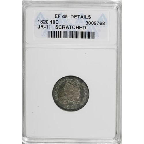 <B>1820 10C Large 0--Scratched--ANACS. XF45 Details. </B></I>JR-11. NGC Census: (7/180). PCGS Population (3/118). Mintage: 942,587. Numismedia Wsl. Price for NGC/PCGS coin in XF45: $359. (#4492)<BR><BR><B>Coin Engraver:</B> John Reich<BR><BR><b>Shipping:</b> Coins & Currency (<a target="_blank" href="http://www.heritageauctions.com/common/shipping.php">view shipping information</a>)