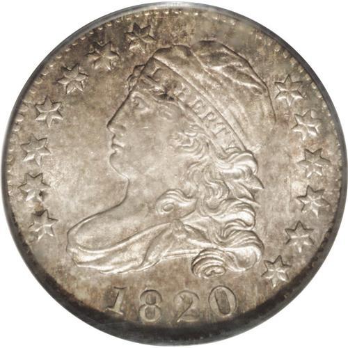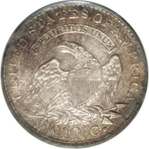 <B>1820<10C> Medium 0 MS65 PCGS.</B></I> JR-11, R.3. Dusky golden-brown and blue-green toning graces this satiny and well struck Gem. Contact is minimal, and the eye appeal is superior. The <I>Guide Book</B></I> and PCGS only recognizes Small and Large 0 varieties, but the <I>Dime Book</B></I> classified several dies, including JR-11, as Medium 0. PCGS generally certifies the Medium 0 varieties as Large 0. Certified in an old green label holder. Population: 11 in 65, 8 finer (7/06).