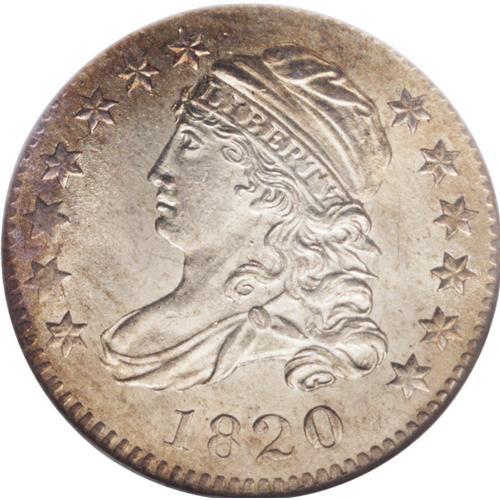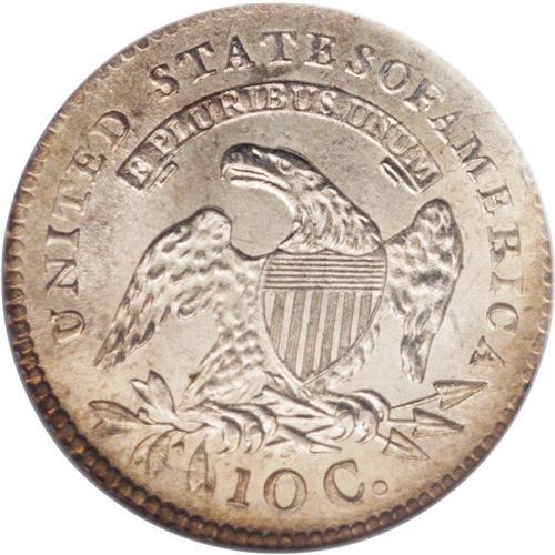 <B>1820<10C> STATESOF MS65 NGC.</B></I> JR-1, R.4. The STATESOF variety is an engraving blunder. Letters in the reverse legend were improperly spaced, crowding OF between STATES and AMERICA. The first STATESOF dimes were struck in 1814. The reverse die was then placed in storage, where it gathered dust until 1820, since no dimes were struck in intervening years. The die returned to use in 1820 paired with a fresh obverse, to strike the scarce JR-1 marriage. This high grade representative has light gold and plum peripheral toning. The obverse die is sunken between stars 2 and 4, and this weakens those stars as well as the final letters in UNITED, which are opposite on the reverse. Otherwise, the strike is exceptional, and both sides are refreshingly void of marks. NGC JR-1 Census: 4 in 65, 1 finer (7/06).