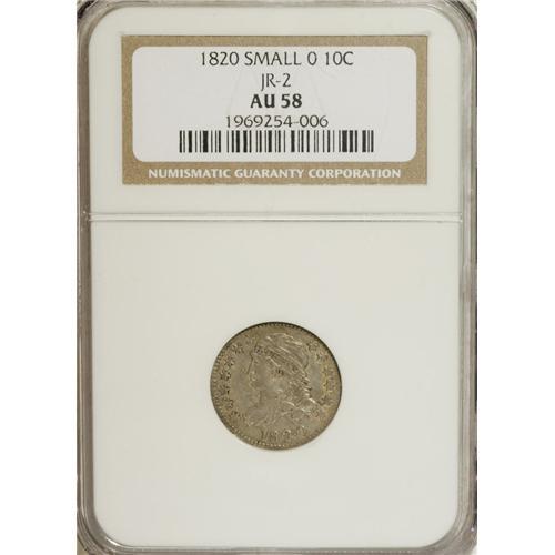 <B>1820 10C Small 0 AU58 NGC.</B></I> JR-2, R.3. Pleasing dove-gray and chestnut toning enriches this smooth and well defined Borderline Uncirculated dime. Only the right-side stars and the lowest hair curls lack a penetrating strike.<BR><BR><b>Shipping:</b> Coins & Currency (<a target="_blank" href="http://www.heritageauctions.com/common/shipping.php">view shipping information</a>)