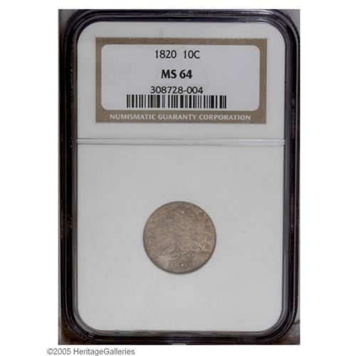 <B>1820<10C> Small 0 MS64 NGC.</B></I> JR-3, R.4. Attributed by the center dot below the ear, and the T of UNITED slightly below the E. Lustrous surfaces are bathed in golden-gray patina, and are devoid of significant marks. Except for a couple of the star centers, the design elements are sharply defined. The devices are well centered on the planchet, and the dentils are complete with relatively nice definition. Population: 57 in 64, 26 finer (10/05).
