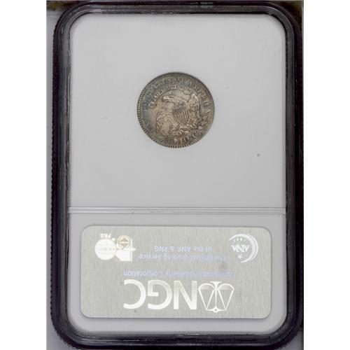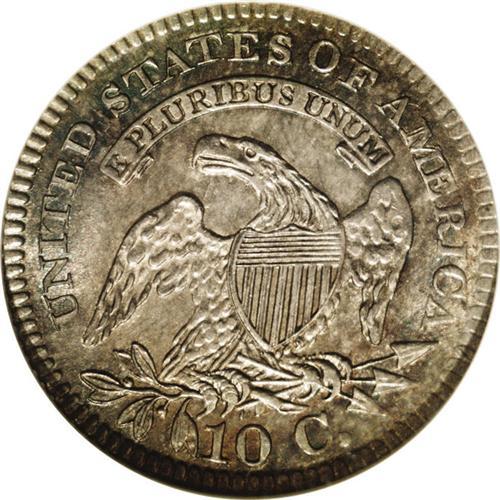 <B>1820<10C> Small 0 MS65 NGC.</B></I> JR-2, R.3. While this is a scarce variety, it is extremely popular among early dime collectors due to the spectacularly amateurish recuttings on the reverse die, commonly called the "Office Boy" reverse. Among other blunders, it shows the remains of an earlier punch between D and S in UNITED STATES; recutting on the third T, which is too high; recutting on the bottoms of S O in STATES OF; clear reworking on the M in AMERICA; and joining of the ME nearby. It is little wonder that--even in a Mint that was not overly concerned about blundered dies--this reverse is unique to this die marriage.<BR> The present example offers beautiful silver-gray surfaces with generous doses of ocean-blue, rose, and copper on the obverse. The reverse is patinated in similar hues. The strike is optimally bold, with good detailing on the left sides but slight weakness on the right sides due to misaligned dies. It is doubtful that the advanced eye appeal of this example will be easily surpassed: both major services together have graded 27 specimens of this date in Gem condition, with 19 higher (3/06). Is that the sound of opportunity knocking?