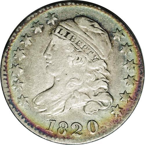 <B>1820<10C> Small 0 JR-3, R.4. Reiver state a. VF35 NGC.</B></I> A beautiful coin that has rainbow peripheral toning which includes bright russet and blue on the obverse, more blue and green on the reverse. No surface problems are present and the obverse has a minor die crack on the right side of the 0 to the dentils below. This die pairing is scarce and few are available in VF or finer to satisfy collector demand. <BR><I>Ex: Steve Fischer (October 1982).</B></I> Envelope Included.