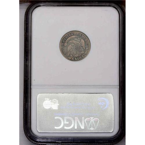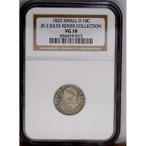 <B>1820<10C> Small 0 JR-2, R.3. Reiver state b. VG10 NGC.</B></I> Dark gray in the fields with lighter silver on the devices. The wear is uneven and we suspect minor die sinking caused what appears to be a rim break above stars two and three. There are some faint scratches crossing Liberty's profile and field to the rim. Jules purchased this coin because of the area near stars two and three, but this is not seen on later coins struck with this die on the JR-3 die pairing.<BR><I>Ex: Julian Leidman (July 1995).</B></I> Envelope Included.