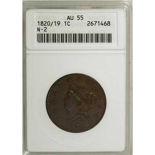 <B>1820/19 1C AU55 ANACS.</B></I> N-2. NGC Census: (0/16). PCGS Population (4/10). Mintage: 4,407,550. Numismedia Wsl. Price for NGC/PCGS coin in AU55: $550. (#1618)<BR><BR><b>Shipping:</b> Coins & Currency (<a target="_blank" href="http://www.heritageauctions.com/common/shipping.php">view shipping information</a>)