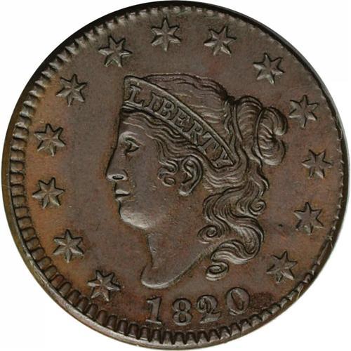 <B>1820/19<1C> Small Date. N-2, High R.2--Environmental Damage--NCS. Unc Details. AU55 EAC.</B></I> Quickly attributed by the die line under the L of LIBERTY. The underdigits are clear under the 20. Struck slightly off-center to the 3 o'clock obverse position, the surfaces exhibit a green-brown color with some brick-red iridescence as the coin turns under a light. Certainly a worthwhile, well defined example.<BR><I>Ex: George Ramont (7/3/1983).</B></I> Envelope Included.