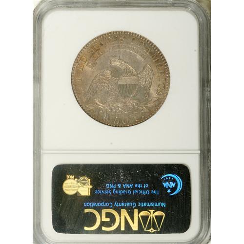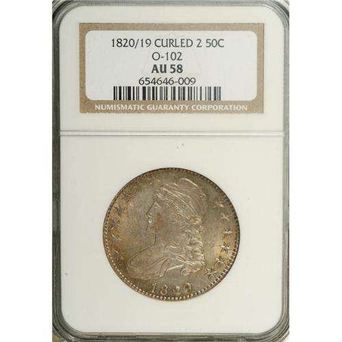 <B>1820/19 50C Curl Base 2 AU58 NGC.</B></I> O-102, R.1. Any 1820 Half Dollar enjoys great popularity as an early issue with one of the lowest mintages in the series (751,122 pieces). The clearly distinguishable overdate on the 1820/19 Curl Base 2 only compounds the coin's desirability. The present example is well defined on the design elements, and displays very strong dentilation. Silver-gray surfaces exhibit considerable luster in the recessed areas, and whispers of reddish-gold patina around the borders and in the fields. The few minor contact marks on Liberty's portrait are not offensive, and the devices are well centered on the planchet.<BR><I>From The Rocky Top Collection of Bust Half Dollars.</B></I><BR><BR><b>Shipping:</b> Coins & Currency (<a target="_blank" href="http://www.heritageauctions.com/common/shipping.php">view shipping information</a>)