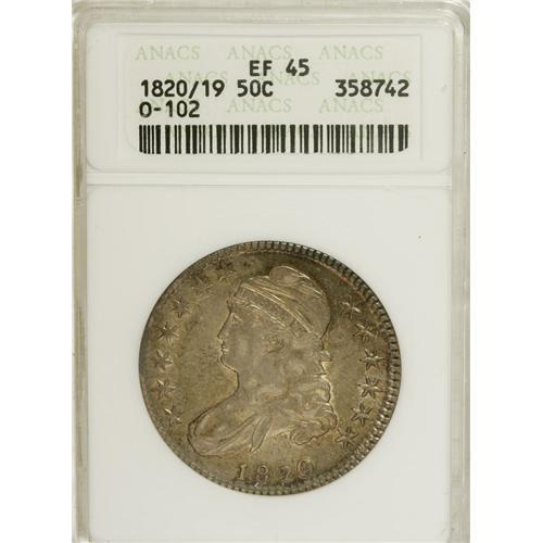 <B>1820/19 50C Curl Base 2 XF45 ANACS.</B></I> O-102, R.1. Orange-gold, lilac, and pale green toning enriches this moderately circulated Bust half. Glimpses of luster brighten design recesses, and there are no relevant marks.<BR><BR><b>Shipping:</b> Coins & Currency (<a target="_blank" href="http://www.heritageauctions.com/common/shipping.php">view shipping information</a>)
