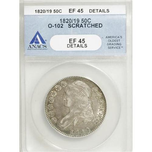 <B>1820/19 50C Curl Base 2--Scratched--ANACS. XF45 Details.</B></I> O-102. Population: 7 in 45, 34 finer (12/07).Census: 0 in 45, 0 finer (12/07).<BR><BR><B>Coin Engraver:</B> John Reich<BR><BR><b>Shipping:</b> Coins & Currency (<a target="_blank" href="http://www.heritageauctions.com/common/shipping.php">view shipping information</a>)